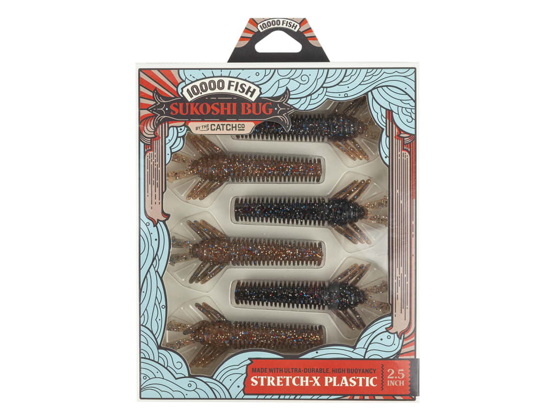 The Sukoshi Bug from 10,000 Fish is a brand new, minimalist, finesse creature bait. The design features a ribbed body made from Stretch-X Plastic, topped of with 6 flapping appendages near the head. The downsized body and tantalizing appendages will make it your new favorite ned rig bait. Stretch-X plastic is just as buoyant as it is durable, and will stand your Sukoshi Bug straight up in the column just begging to be bit. While designed to be ned rigged, it will also generate strikes on a micro-Carolina rig, or as a trailed on your finesse jigs. Whether you drag it over bottom structure or across beds on a Mojo rig, or finesse it on a ned-head, you’ll want the Sukoshi Bug in your arsenal ASAP.
