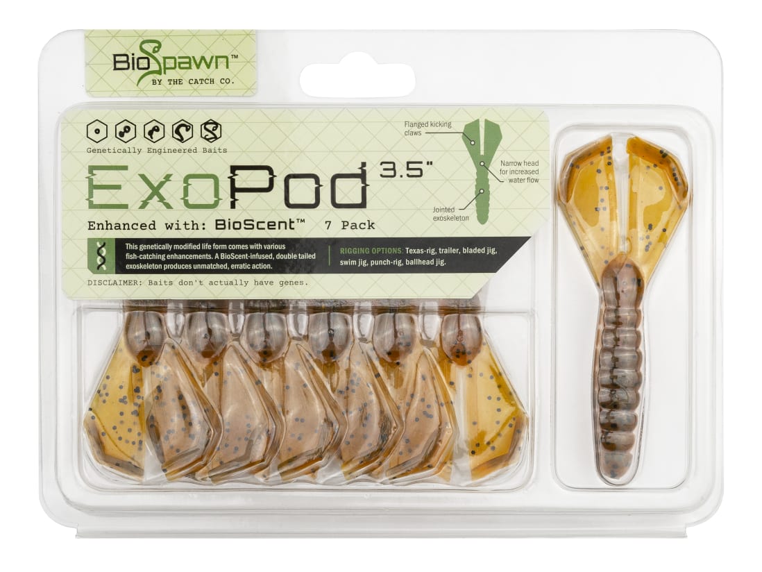 The Biospawn ExoPod is a genetically engineered creature bait built with a streamlined flapping action. The ExoPod’s compact and practical design allows for easy rigging for multiple presentations. At 3.5″ the ExoPod is the perfect trailer for any jig or bladed bait. And it has enough bulkiness and action to be rigged independently on a punch rig or finesse Texas/Carolina rig. The classic BioSpawn ribbed body design seamlessly leads into two flapping flanges that give the ExoPod a subtle but distinctive swimming action.