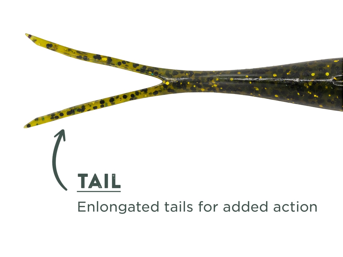 Best deployed on a EWG hook, rigged weedless through the hook channel. Use short pops along the surface around vegetation. Glide and dart through open water around schooling baitfish. The elongated tail simulates action of dying baitfish to stimulate predators. Can also be operated as a trailer if the situation arises.