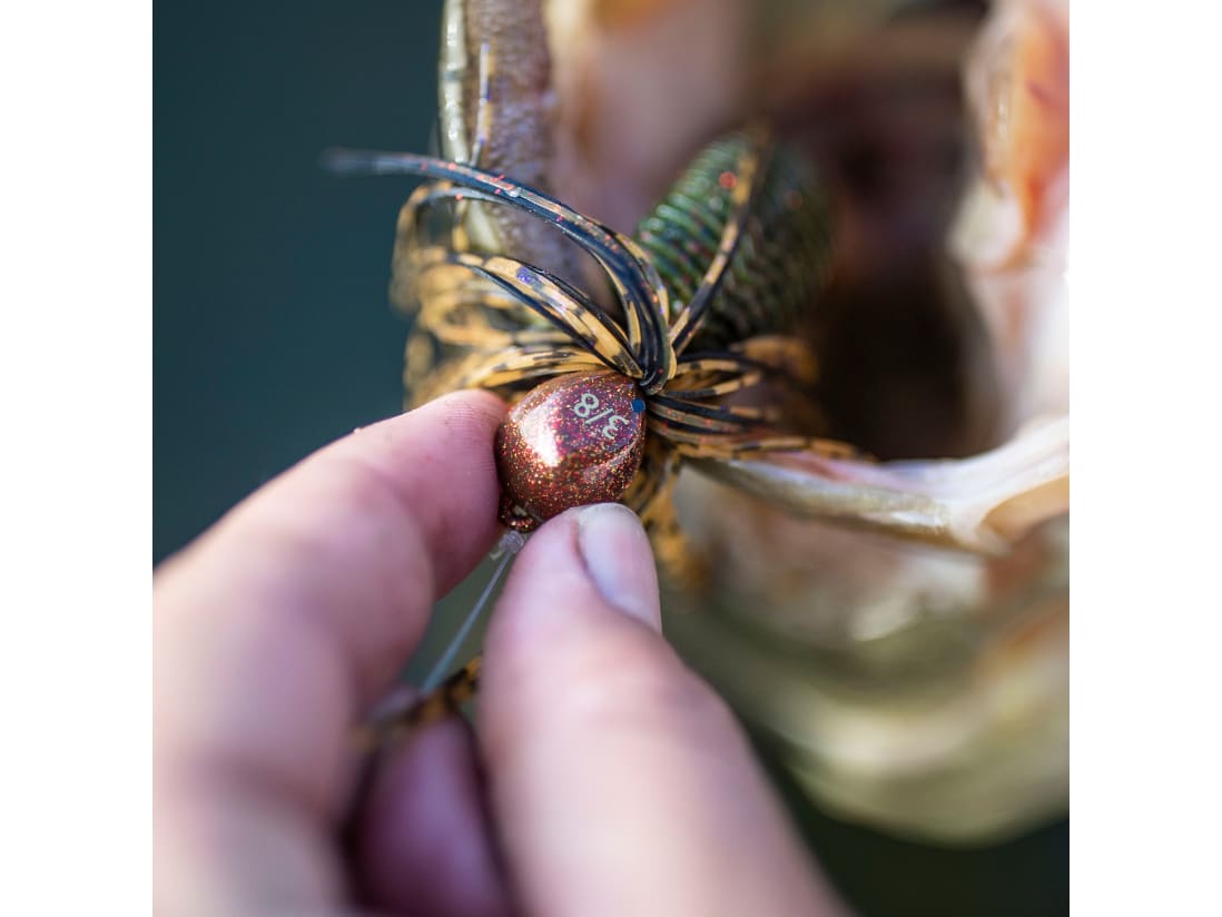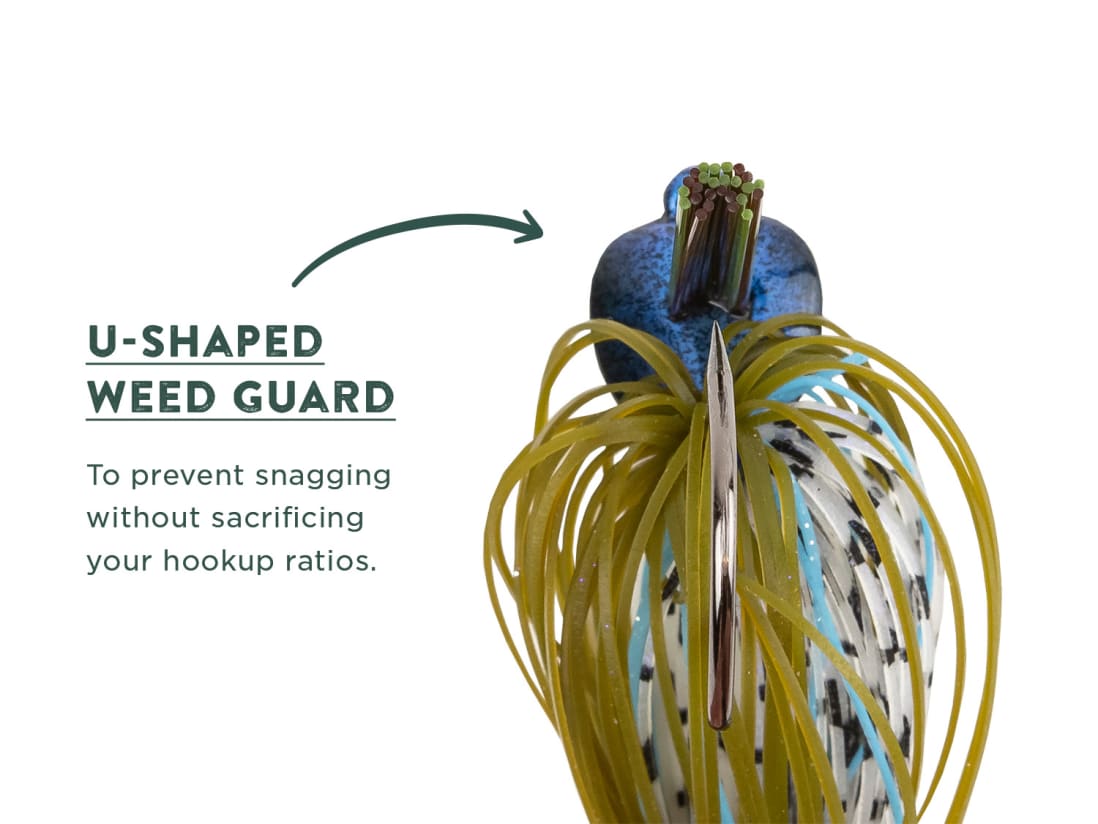 Each Juicee Jig comes with the weight size painted on its head for easy identification. The Juicee Jig also features a U-shaped weedguard that helps prevent snags while increasing your chances of hook up. Built around a Mustad Hook, the Juicee jig features a hand-tied skirt and a double-pronged trailer keeper.