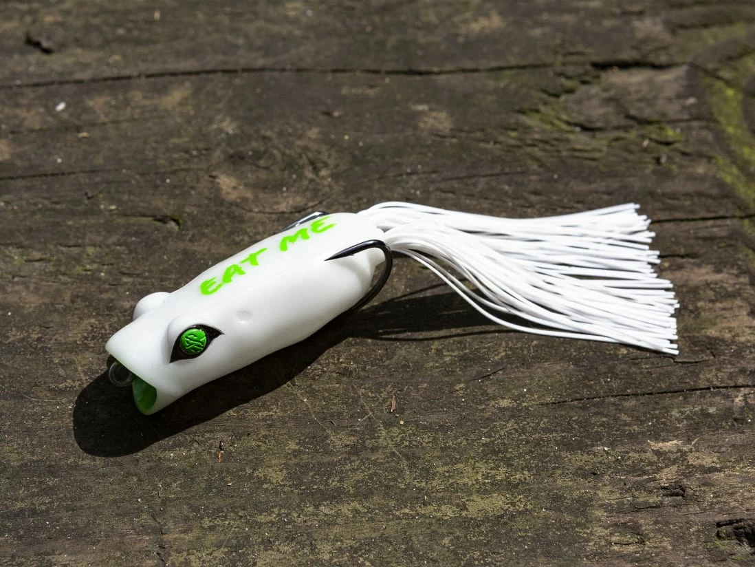Popping: Keeping your rod tip down, twitch your rod on a slackline with pauses between twitches to make the frog spit and splash water.