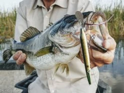A thin, elongated, minimalist body sports a belly line tie and a single treble hook. The weighted tail blade connects to a rear, feathered treble hook to accentuate swimming motion and focus strike attention. Ten body-blade-feather patterns cater to any situation or water color.